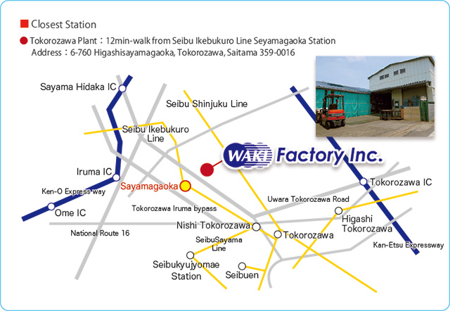 | ◉ Address: ◇ Headquarters・3-17-3 Imagawa, Suginami-ku, Tokio 167-0035 ◇ Tokorozawa Plant・6-760 Higashisayamagaoka, Tokorozawa, Saitama 359-0016 ・Ph.+81 4- 2922-5431/ Fax +81 4-2922-5430 ◇ Sayama Plant・1718 Horigane, Sayama, Saitama 350-1312 ・Ph.+81 4-2968-8904 /Fax +81 4-2968-8905 |